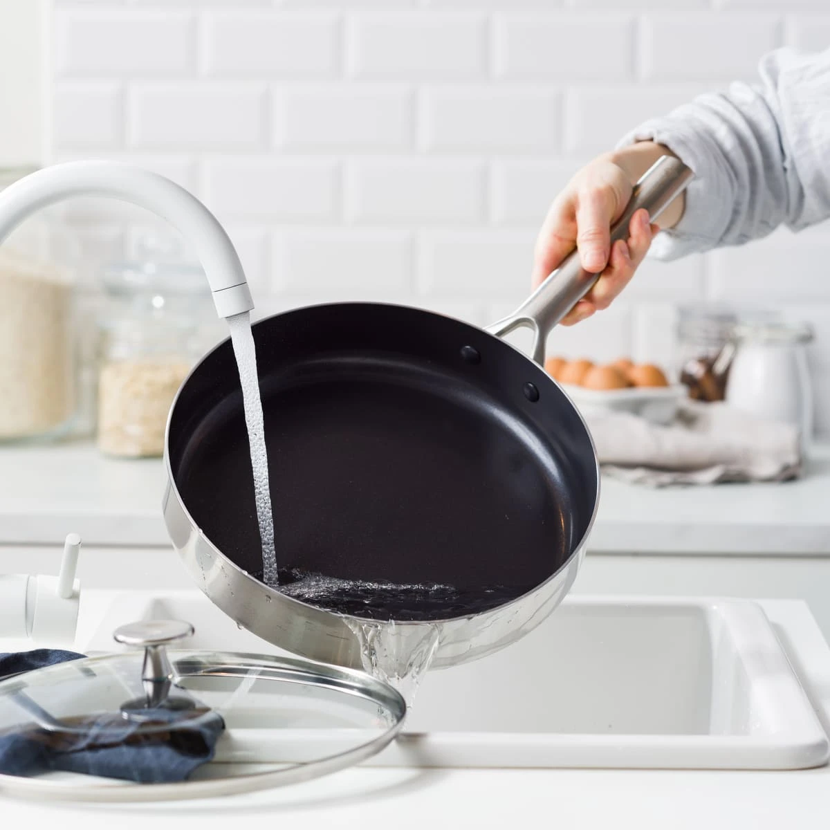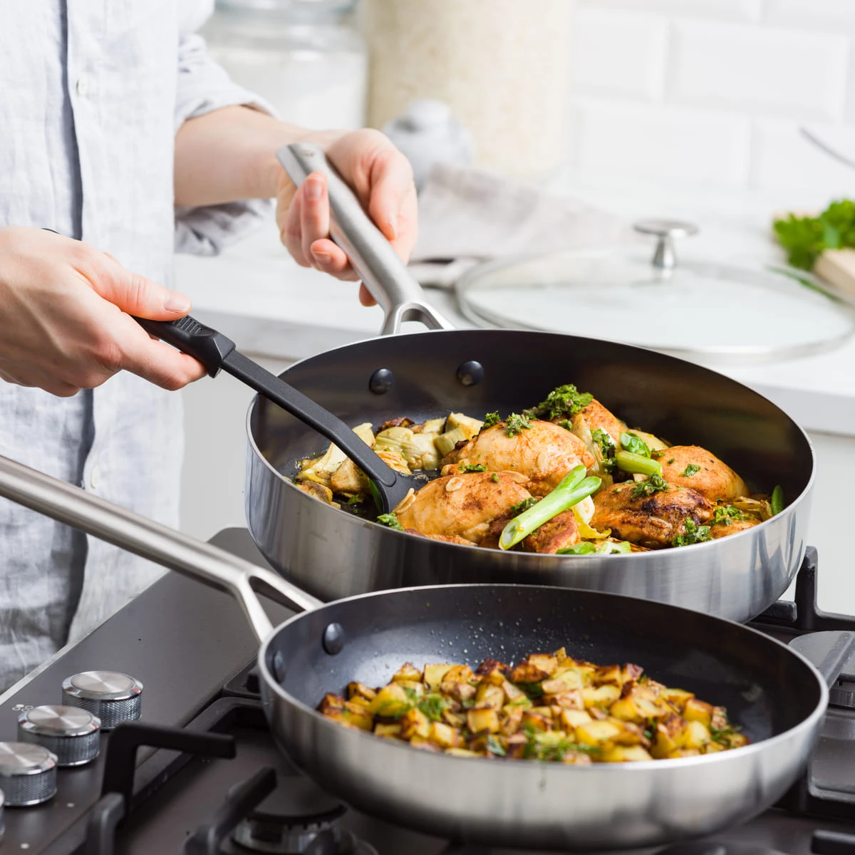 Triple Steel features two stainless steel layers surrounding an aluminum core that extends throughout the pan to deliver responsive performance with unbelievable power.