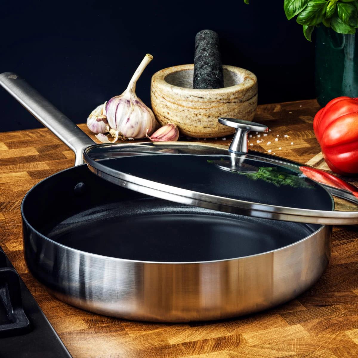 Shine on the stovetop with Blue Diamond’s Triple Steel collection. Blue Diamond Triple Steel features two stainless steel layers surrounding an aluminium core that extends throughout the pan to deliver responsive performance with unbelievable power. Our unique Midnight Diamond coating is an eye-catching update that works with the 3-ply body to promote fast and even heating, incredible durability, and dazzling results on all stovetops, including induction. Metal utensil safe, Blue Diamond’s diamond-infused coating is 5x harder and 10x longer lasting than traditional nonstick, and best of all they are toxin free! No PFAS, PFOA, lead, or cadmium! The stainless steel V-cutout handles keep the collection comfortable on the stovetop while their unique angle makes these pans stackable for easy storage. Glass lids provide an easy view at any meal in progress and optimal for steaming and grease protection. Dishwasher safe. Oven safe to 220°C, glass lids to 100°C.