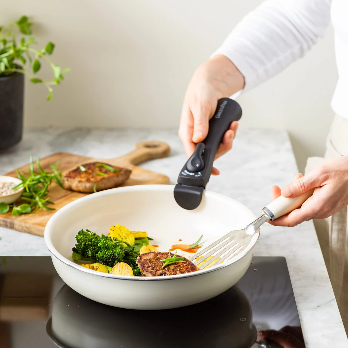 A space-saving solution with big performance, Click Chef streamlines your stovetop with high-wall pots and pans and an ingenious detachable handle. The handle clips on and off to eliminate stovetop crowding, make transfers effortless and cleaning easy. Pots and pans can be stacked on top of each other for easy storage, making them perfect for saving space.