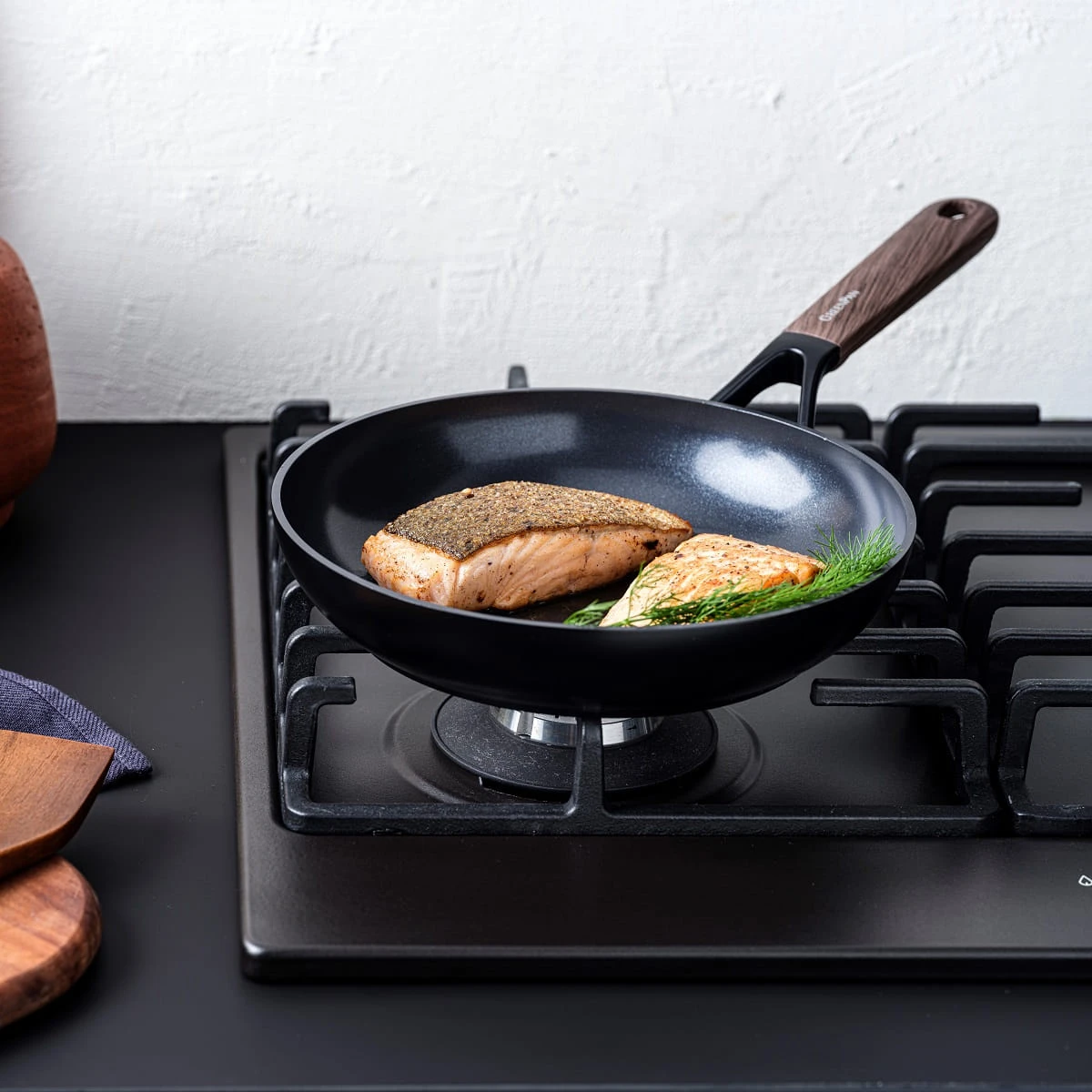 A lot of thought went in these pans. The wood-effect handles stay cool thanks to a rivetless v-shaped design, which allows these pans to store and stack easily, creating up to 30% more cabinet space. Crafted from hard anodized aluminium and finished with a MagnetoTM base, these pans are extra tough and produce incredible results all on stovetops. Each pan is finished with our diamond-reinforced ceramic non-stick coating for unparalleled performance and effortless cleaning.