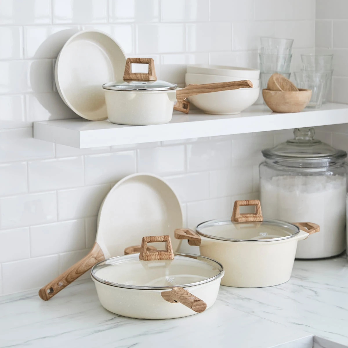 8pc Cookware Set, Cream With White Speckle