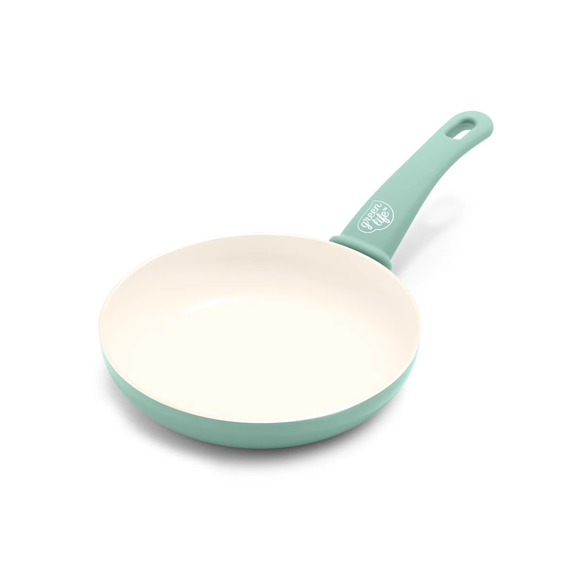 The GreenLife Soft Grip 20cm ceramic non-stick frying pan brighten any kitchen with its vivid turquoise colour. The high performance ceramic non-stick coating is long lasting and easy to clean, made without PFAS chemicals. The turquoise aluminium reinforced body adds a touch of style to your kitchen, while the matching stay-cool handles provide much-needed comfort. The dishwasher-safe construction makes cleanup a breeze