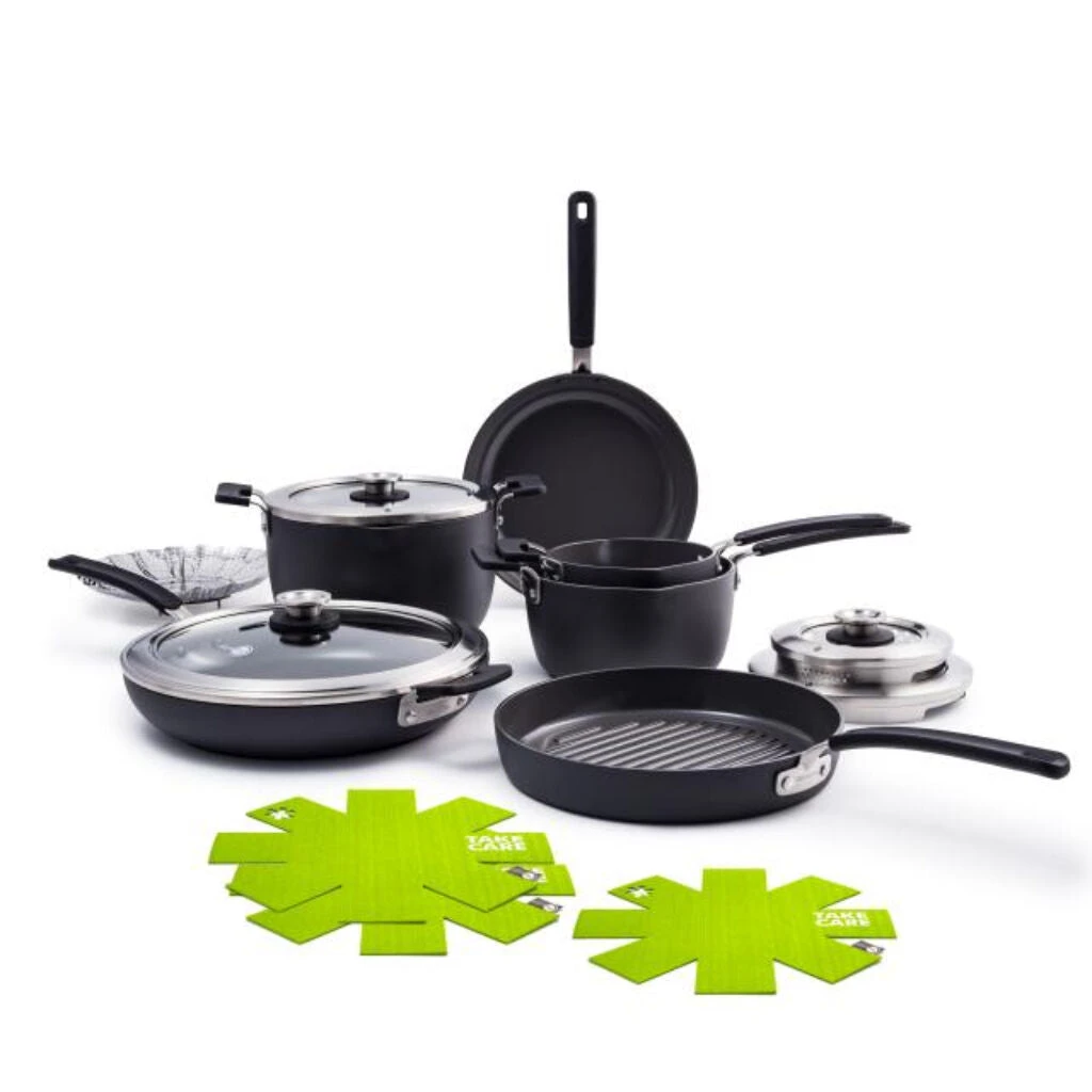 Save space without sacrificing performance with the first space-saving ceramic nonstick cookware set, Levels features a diamond-infused ceramic nonstick coating that’s extremely durable, metal utensil safe, and provides excellent heat transfer. Only 13.5″ tall stacked—The Levels Collection uses 30% less cabinet space than traditional sets. Diamond Advanced Ceramic Nonstick Coating—Multiple diamond-infused layers make our signature healthy ceramic nonstick coating extremely durable, metal utensil safe and give each pan excellent heat transfer. Free of PFAS, PFOA, lead and cadmium, which guarantees that no toxic fumes will release even when accidentally overheated. Set includes: 10” fry pan, 12.5” covered fry pan, 11” round grill pan, 1.6QT covered saucepan, 3.2QT covered saucepan, 6QT covered stockpot, stainless steel foldable flower steamer, 3 protective sheets [Details]