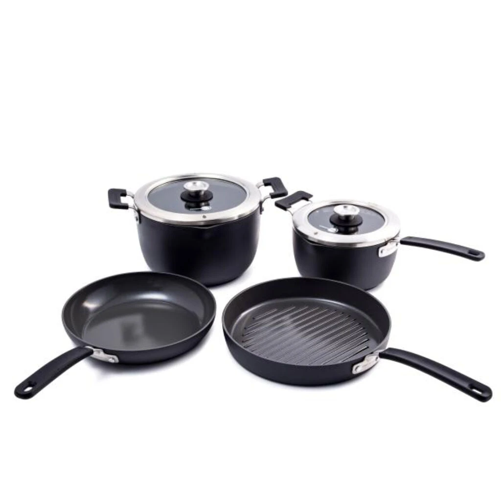Not just stackable, this collection features unique nesting lids that make sure everything stays together. Each pan also features a diamond-infused ceramic nonstick coating that makes each extremely durable and provides outstanding performance. Only 9.75″ tall stacked—The Levels Collection uses 30% less cabinet space than traditional sets. Diamond Advanced Ceramic Nonstick Coating—Multiple diamond-infused layers make our signature healthy ceramic nonstick coating extremely durable, metal utensil safe and give each pan excellent heat transfer. Free of PFAS, PFOA, lead and cadmium, which guarantees that no toxic fumes will release even when accidentally overheated. Set includes 10” fry pan, 11” round grill pan, 3.2QT covered saucepan, 6QT covered stockpot. [Details]