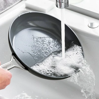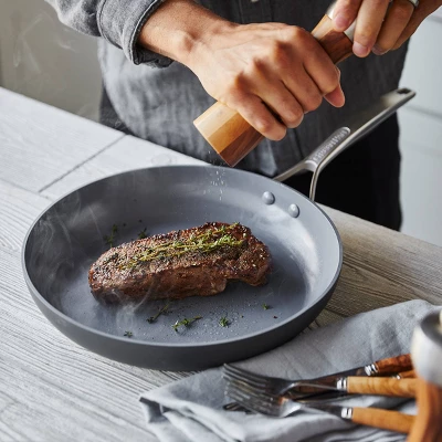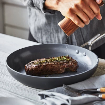 Featuring GreenPan’s signature healthy ceramic nonstick coating, the Paris Pro collection is twice as strong as stainless steel thanks to hard anodized aluminum bodies (plus it’s metal utensil safe). Made to last, it won’t warp, chip, or scratch and it’s free of PFAS, PFOA, lead, and cadmium, too. For searing, sautéing, and more this versatile 12” frypan is equipped with a riveted oven-proof stainless steel handle for a secure grip.