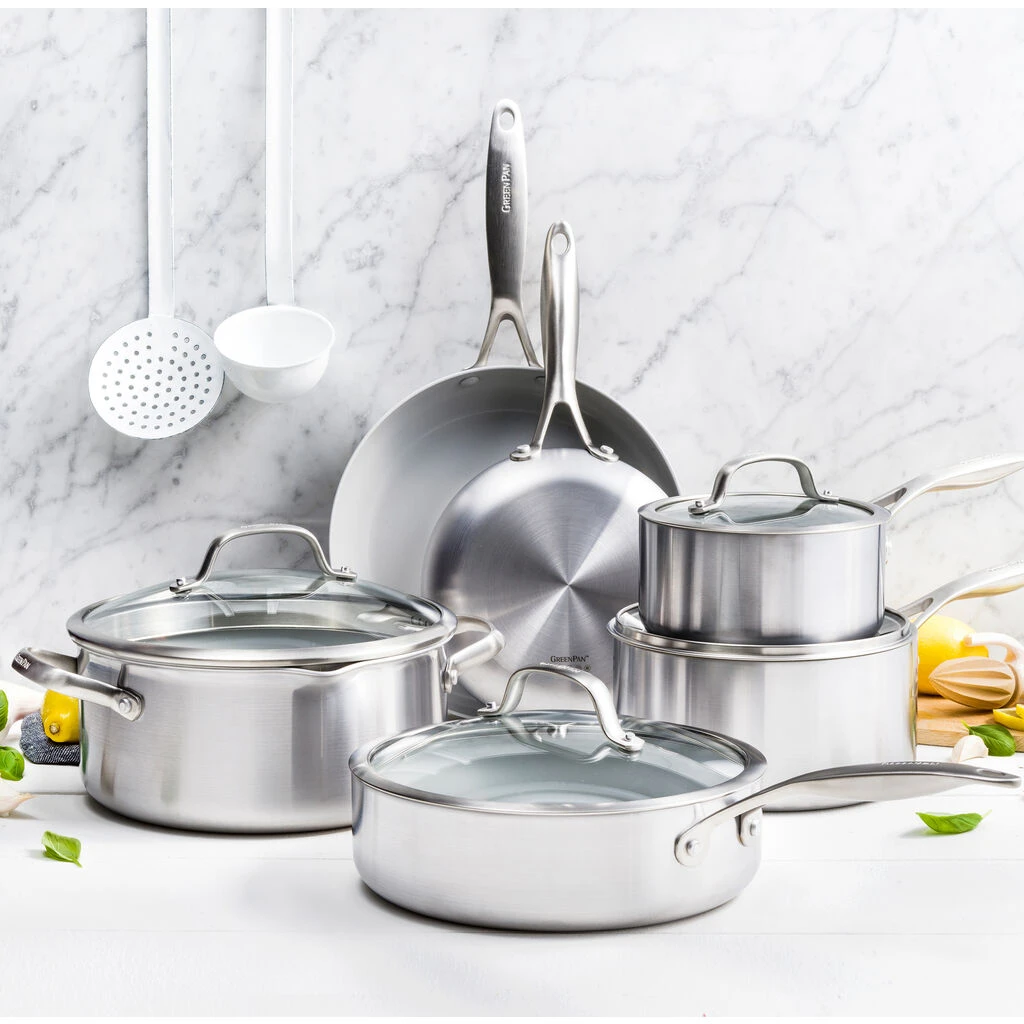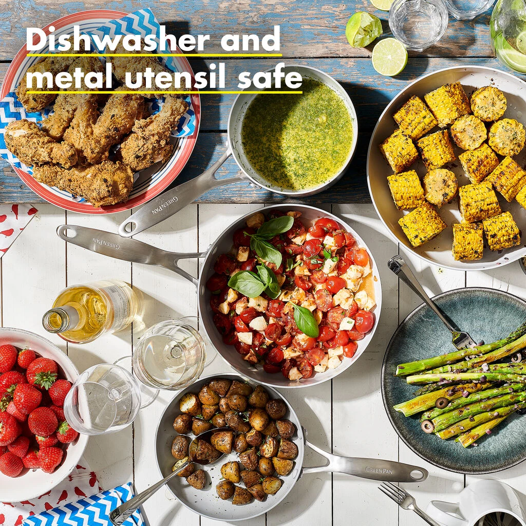With riveted, ergonomic stainless steel handles for a comfortable grip and easy transport, each piece within this dynamic cookware set is grill-safe, dishwasher-safe, oven-safe up to 600ยฐF, and safe for use with metal utensils, giving you ultimate cooking versatility. For truly stainless steel cookware thatโs built to last, try the Venice Pro Evershine 10-Piece Cookware Set by GreenPan today!
