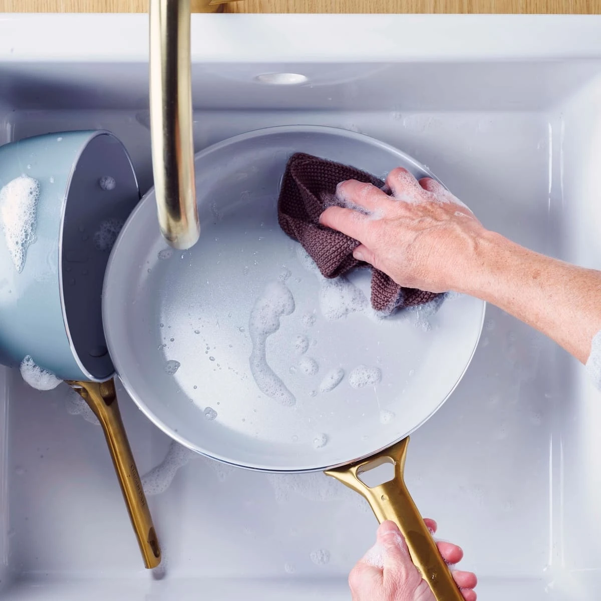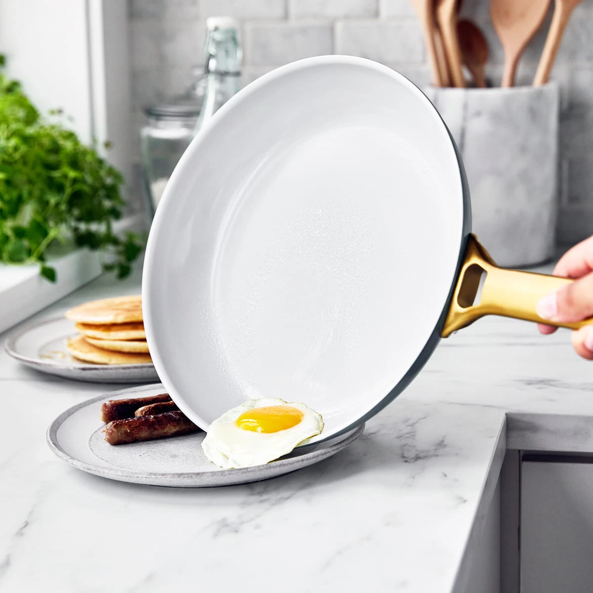 In an eye candy shade of smokey sky blue that will complement any kitchen, this set from our Padova collection is more than its looks: duo forged hard anodised aluminium construction makes them extra tough and scratch-resistant while also promoting even heat distribution. Each piece features our Thermolon™ healthy ceramic non-stick coating, which is reinforced with diamonds to make it ultra-durable and heat responsive (all free of PFAS, PFOA, lead, and cadmium). With a set that’s made to cover everything, the meal possibilities are endless – flavourful frittatas, stir fries, and perfectly seared seafood are just the start.