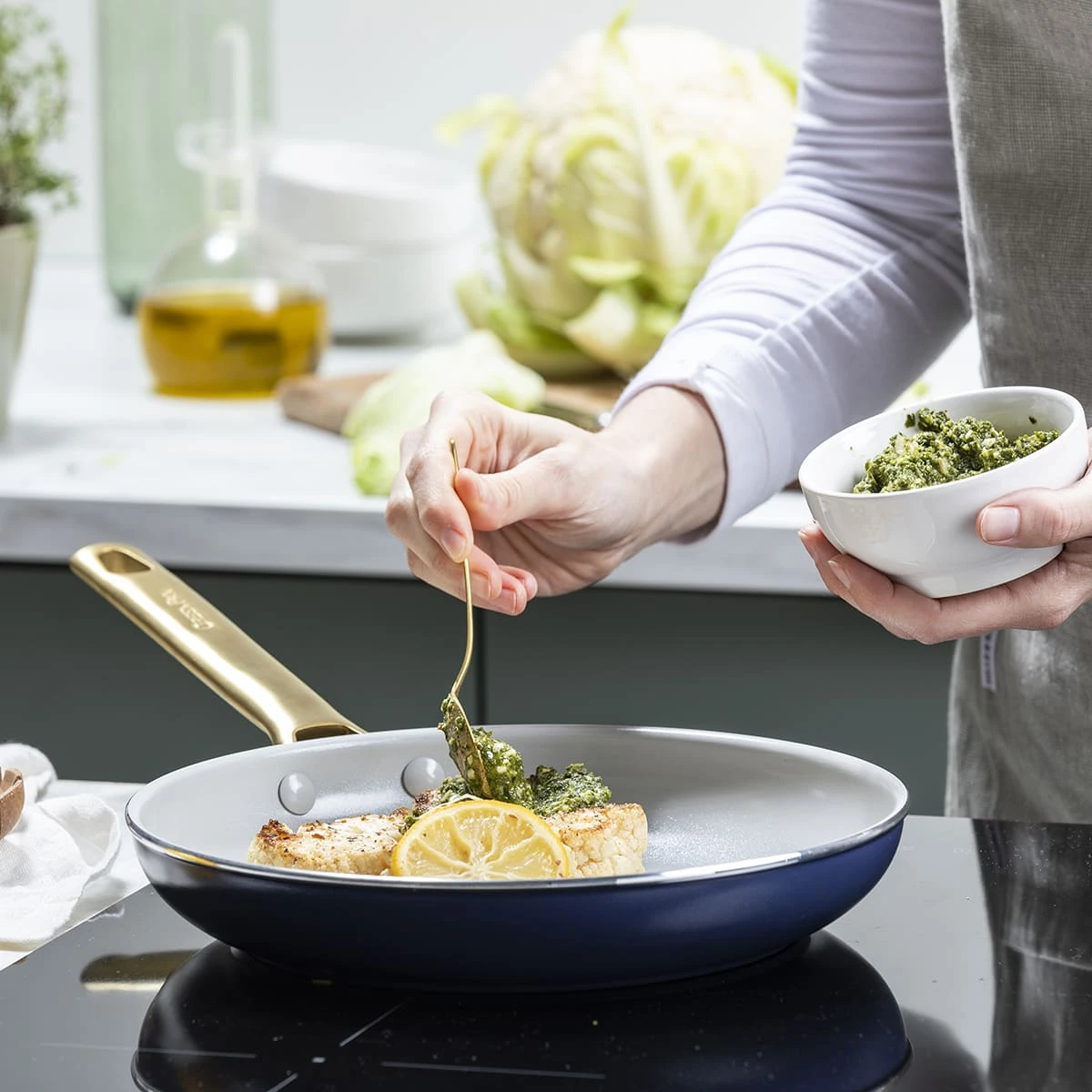 In a sophisticated dark blue shade that will complement any kitchen, this frying pan from our Padova collection is more than its looks: duo forged hard anodised aluminium construction makes it extra tough and scratch-resistant while also promoting even heat distribution. It features our Thermolon healthy ceramic non-stick coating, which is reinforced with diamonds to make it ultra-durable and heat responsive (all free of PFAS, PFOA, lead, and cadmium).