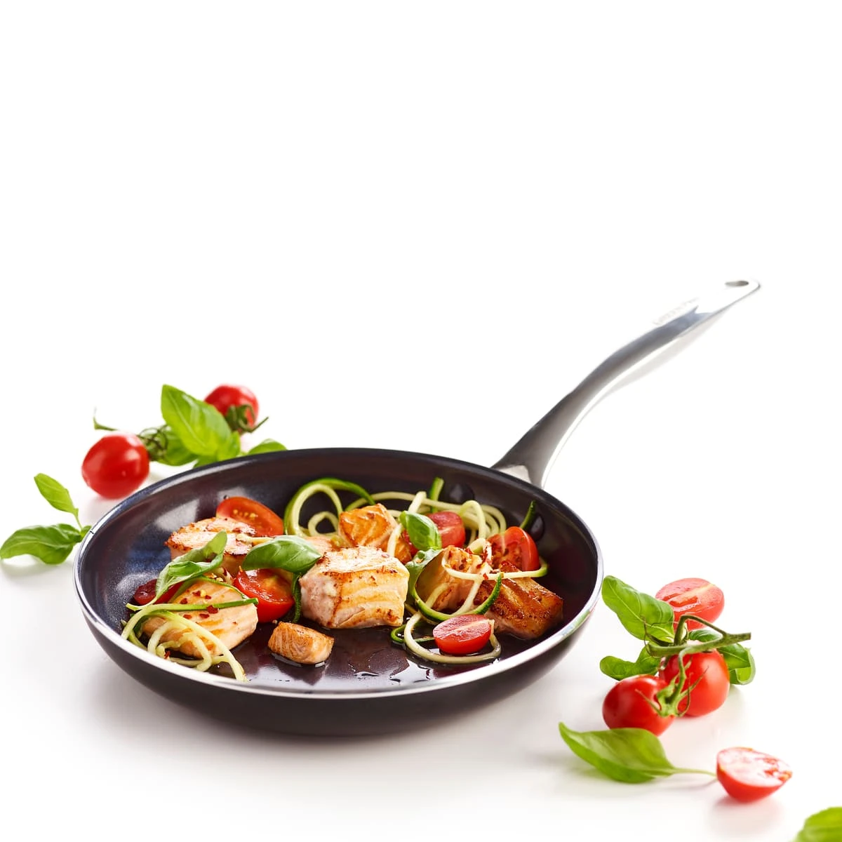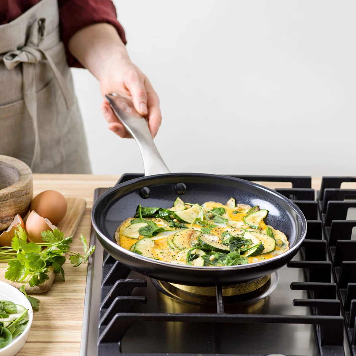 Royal is perfect to give your daily cooking sessions an elegant touch! Its timeless design includes a brushed stainless steel handle. The collection features our Thermolonâ„¢ ceramic non-stick coating, which is reinforced with diamonds to make it ultra-durable and heat responsive (all free of PFAS, PFOA, lead, and cadmium). This non-toxic cookware is made of high-quality aluminium, which makes it perfect for heavy-duty use. A thick forged base guarantees even heat distribution and maximum hob stability while the drip-free edges make pouring simple. The range performs excellent on all stovetops and is oven & dishwasher safe for everyday convenience.